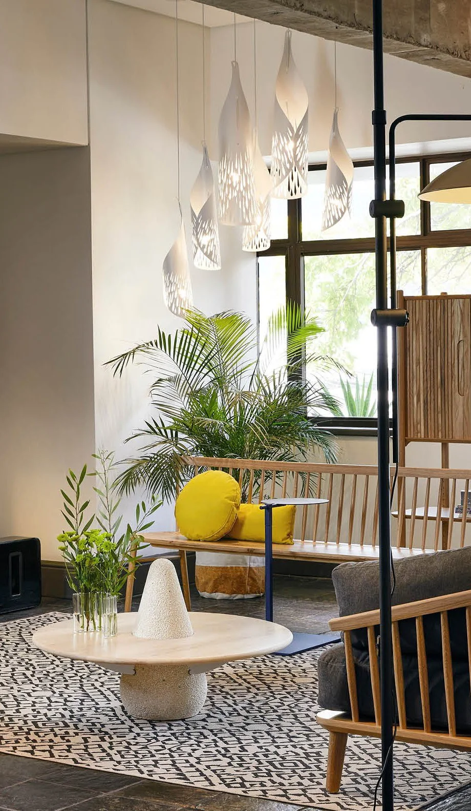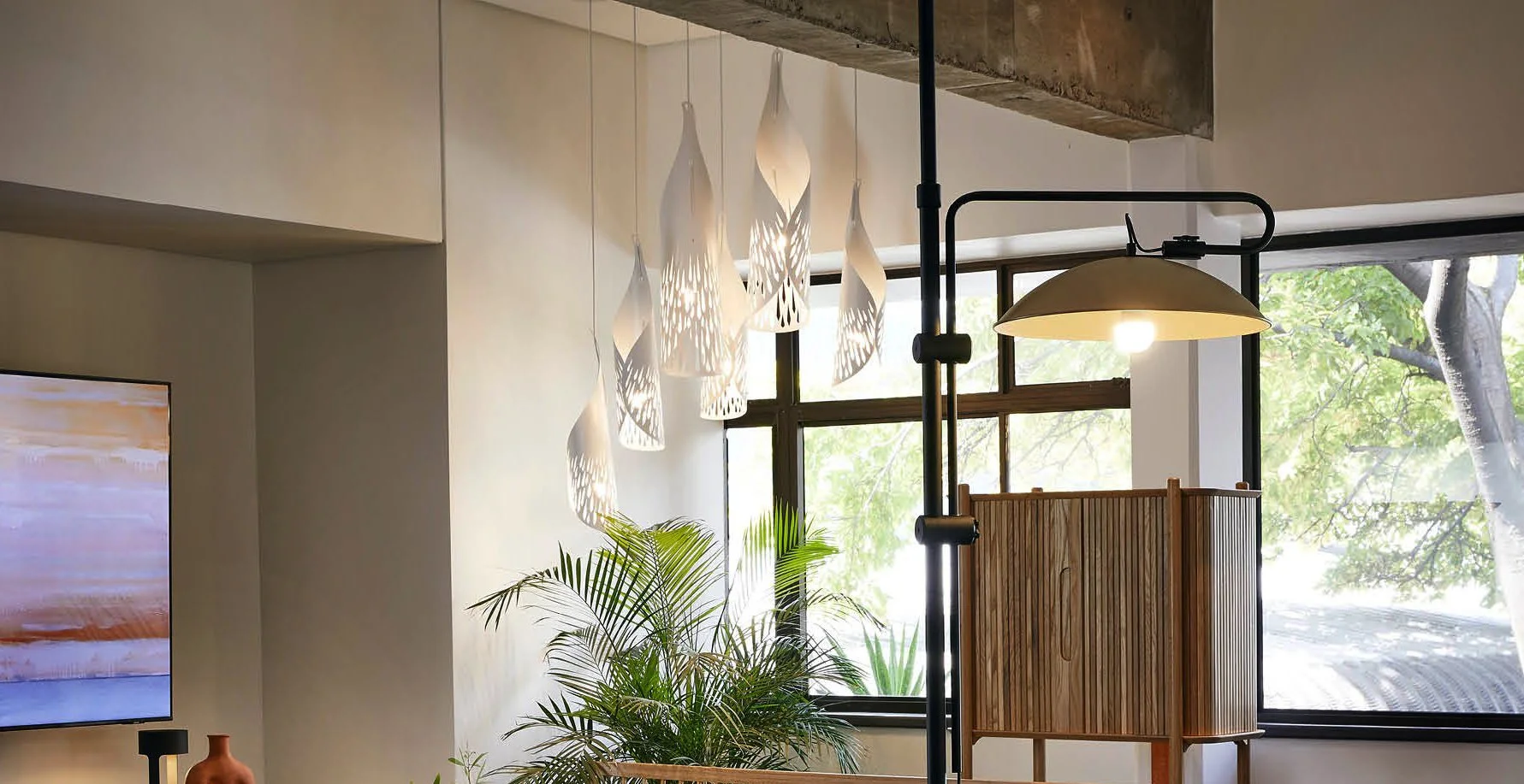The Palm is a decorative pendant lamp designed to emit light from the cut shapes. The bulb is partially hidden from direct view and we recommend a warm decorative LED bulb for ambient use.