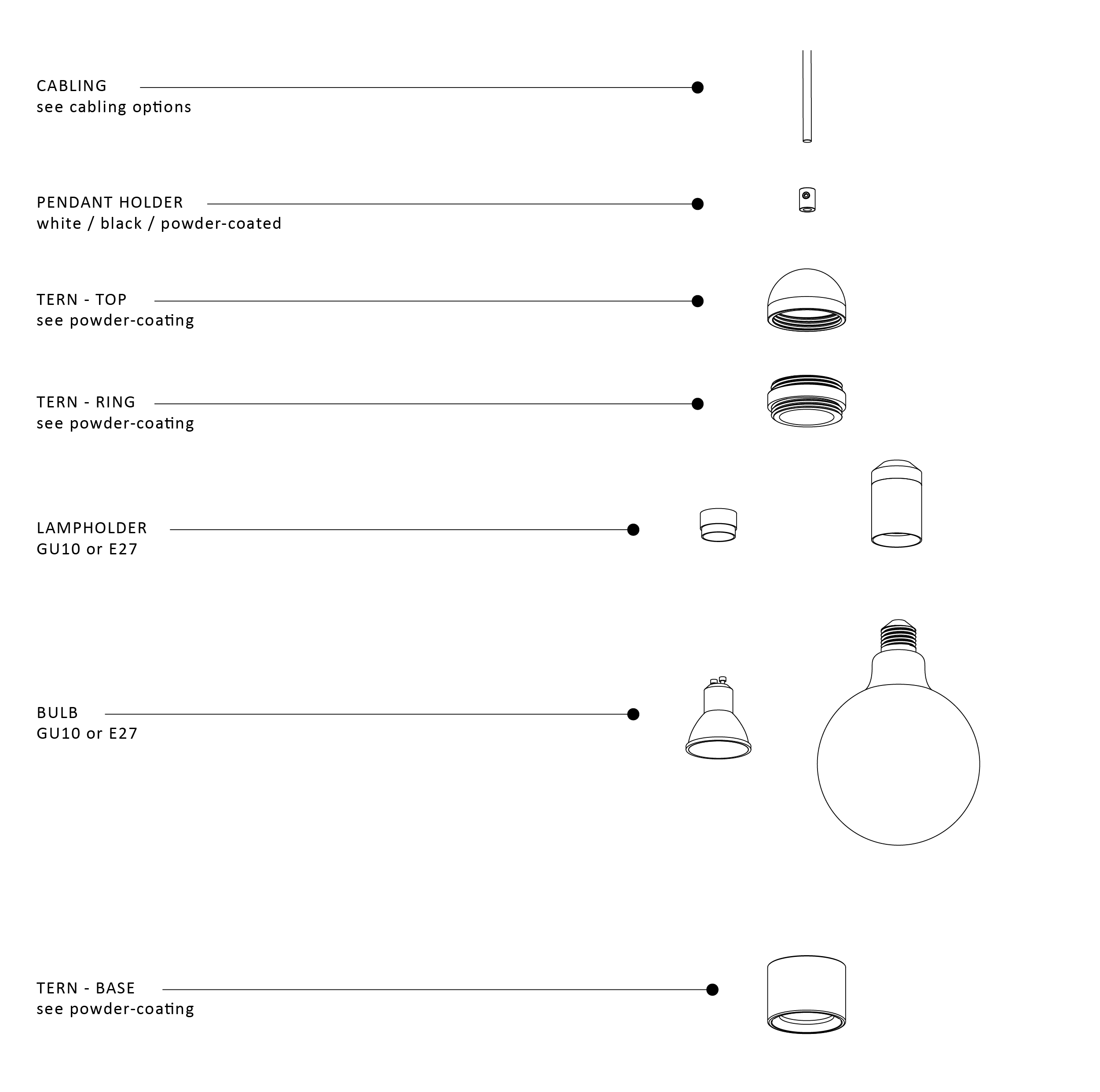 The Tern is a three part aluminium casing that houses either a GU10 or an E27 bulb. It is designed to either suspend a lampshade or to be hung independently as a pendant.