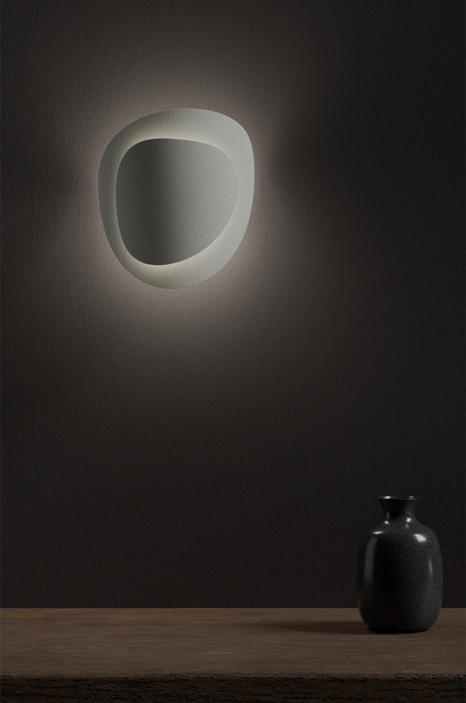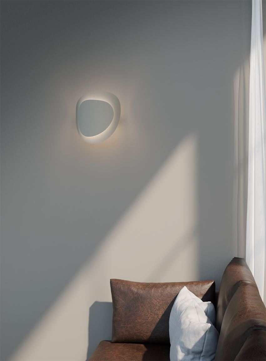This wall light is made from two layered rolled shapes, which allow light to glow through the space between, creating a soft wash of light.